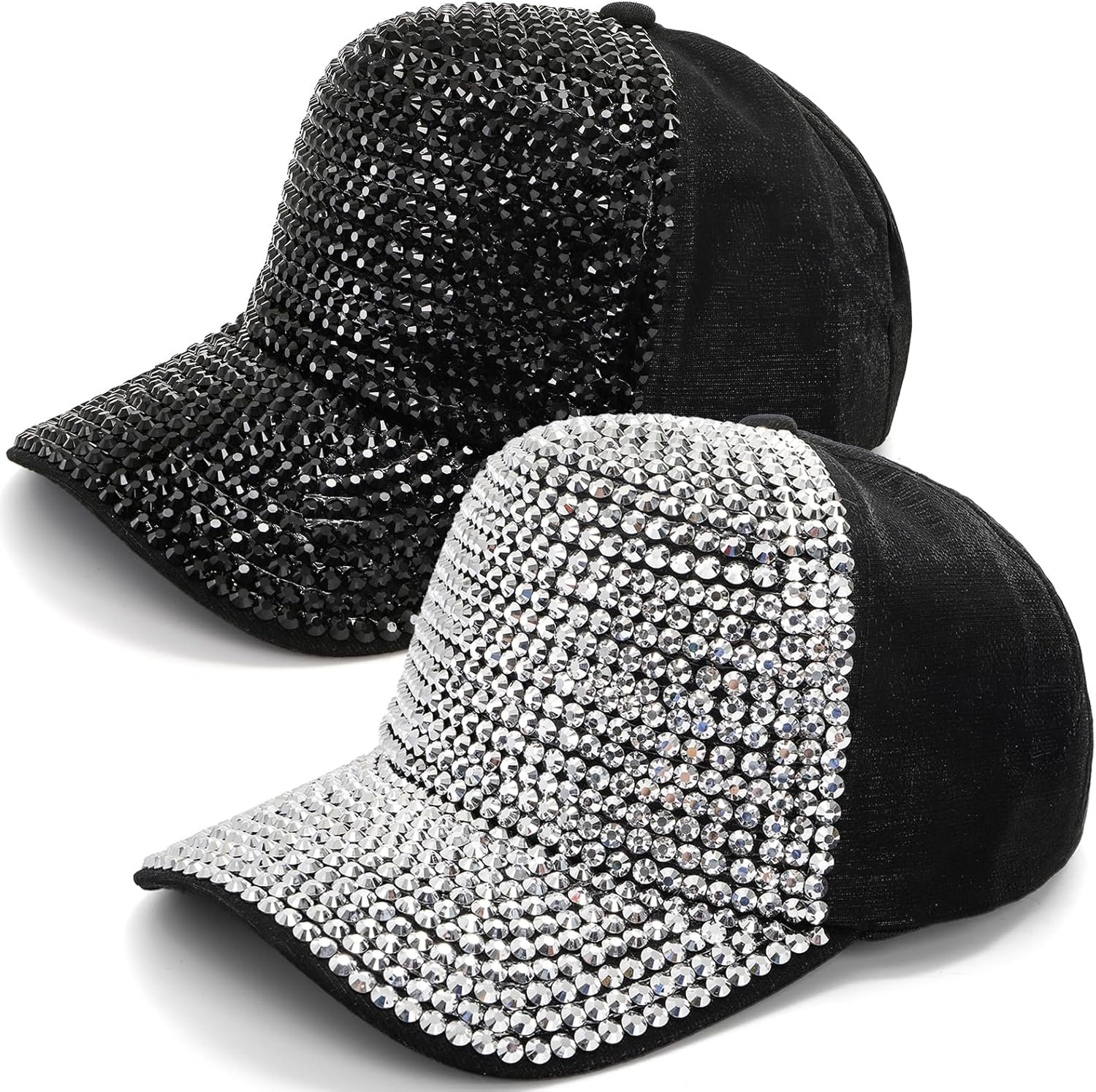 Set of 2 Rhinestone Baseball Caps, Adjustable Snapback Baseball Hat for Women Men, Breathable Sparkle Bling Sun Hat for Sport, Party, Outdoor Activities Black